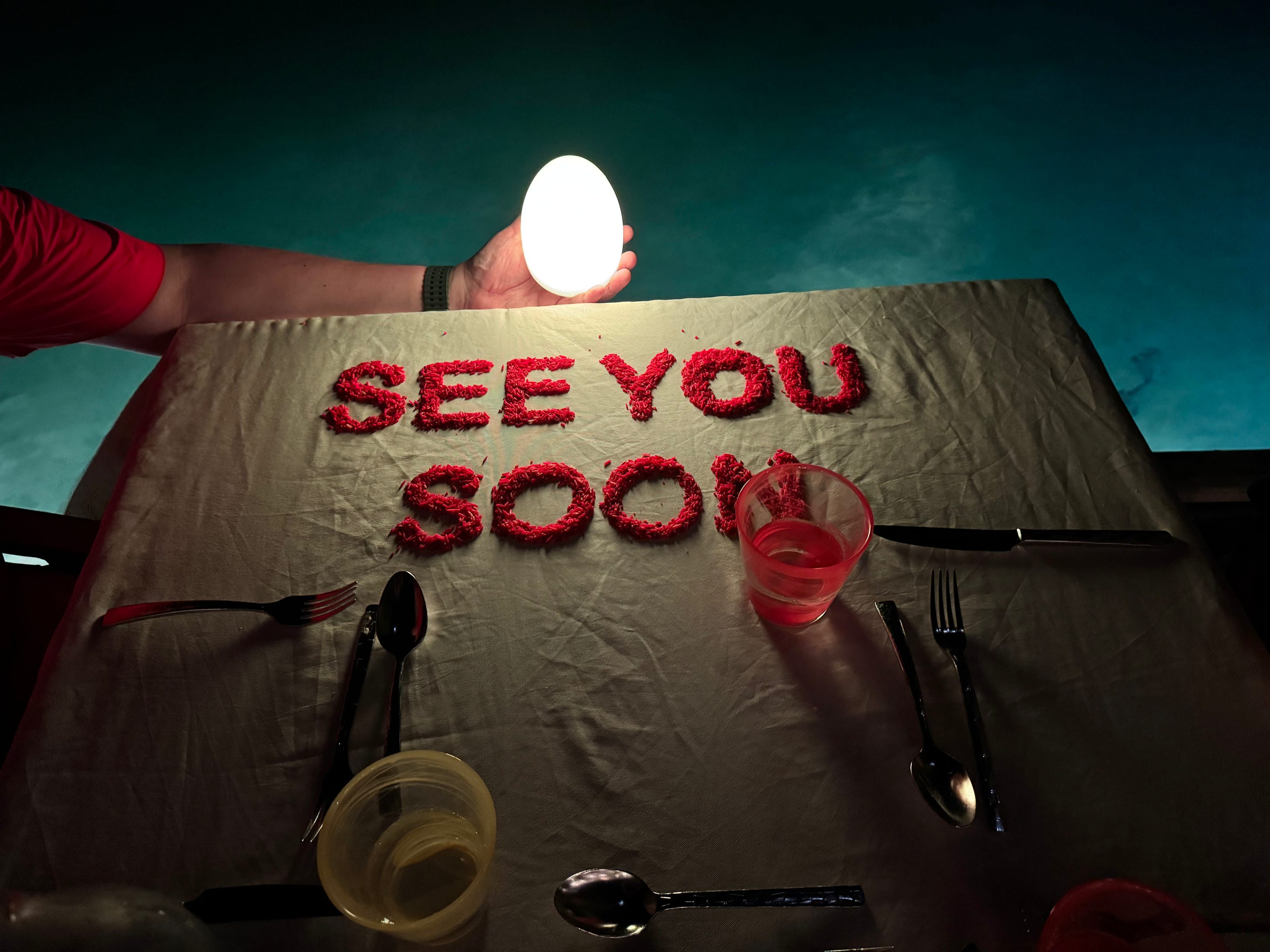 Am letzten Tag zeigt sich auch die Sonne bzw. ein sehr schöner Sonnenuntergang. Im Restaurant haben sie uns einen schönen Tisch am Wasser vorbereitet … und auch hier nochmal den Gruß wiederholt.
